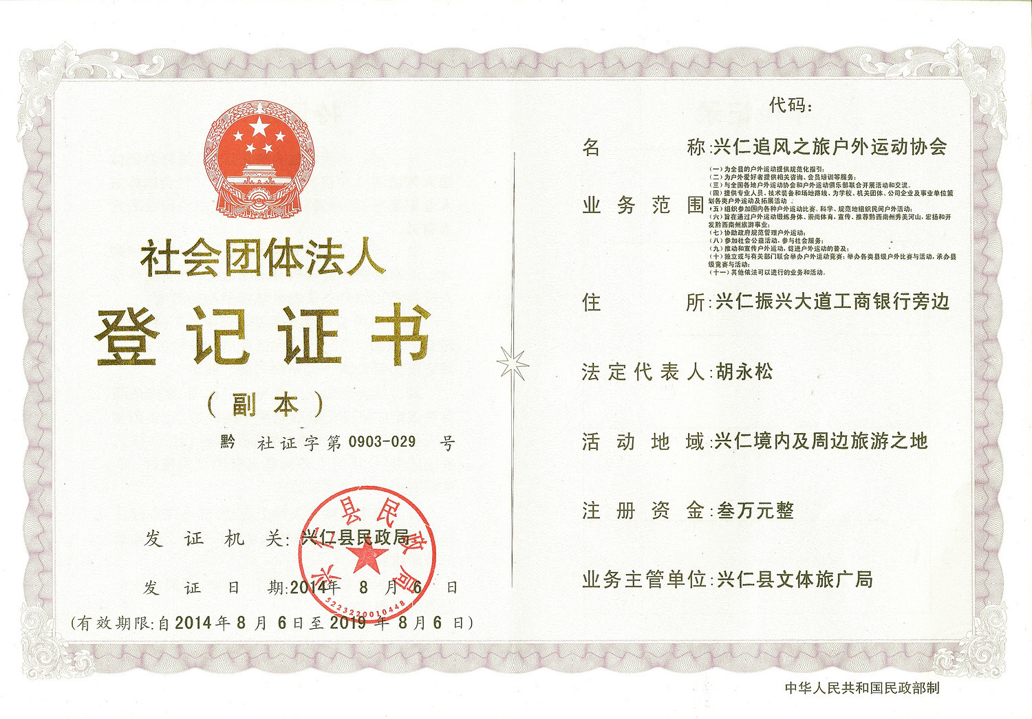 追风之旅户外俱乐部于2009年9月8日,经工商部门批准注册,注册号:522322600009186