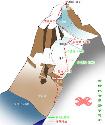 大海子(4100)是一个南北走向的狭长高山湖泊,东壁大本营可设在大海子南端小山坡上或北端水边。由大本营沿碎石坡上升至约4400米处需攀登一段60米长,坡度约55-60度的岩壁,翻上岩壁后,需沿右方向的积雪滚石坡坡继续上升,翻越一小段岩石地形后接近东壁冰川下端(4600),如果攀登计划时间充裕可以在此设立C1,以减轻攀登强度,增加应变能力。继续向右行进一小段后,应及时切上冰川。由于这一段路线视野并不开朗,地形也与从大本营观察时印象不同,很容易错过最佳路线,好在路线不长,坚持上升后一切就会清楚明朗。冰川上裂缝随处可见,在接近5000米处裂缝发育得更加明显,需小心通过。经过裂缝区后,坡度明显减缓,这里是设立C2最佳地点。从C2向顶峰方向可以望见带雪檐的冰川边缘和雪檐下陡峭的雪坡,雪坡下部渐渐平缓与C2所在平台相连,这里是通向顶峰的必经之路。