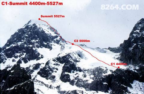 D6:冲顶并下撤到C1; 在冲顶途中有一段大冰壁(有三个绳距,协作提前铺好绳)