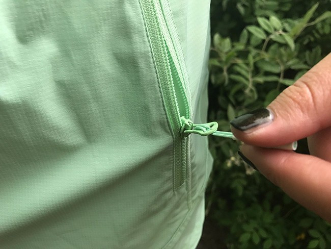 门襟和插手口袋拉链都带有加长拉绳,由于保证衣服的轻盈,所以拉链的硬件都相对袖珍,加长拉绳方便了拉链的操作。