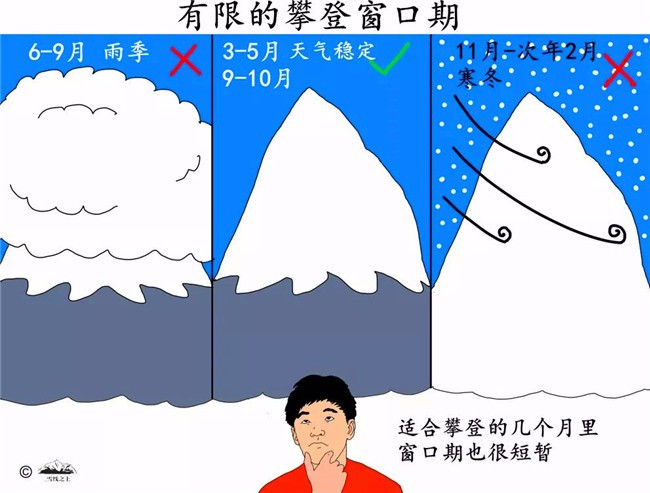 登山者要避开雨季、严酷的寒冬,这些季节要雪崩频发,要么风雪残酷,是登山的气候禁区。一年之中只有少数几个月中,会出现几天稳定的好天气,让登山者见缝插针去攀登。