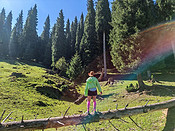 乌孙古道走不了,喀拉峻大环线也太麻烦,那就上琼库什台后山来转转吧!车可以一直开到上面的停车场,但是再往里就不被允许了,虽然车还可以开。从这里只能选择骑马或者走路。这就是商业化带来的弊端,当然也是优点,让有钱人玩的尽兴。还可以乘坐直升机观景呢!哈萨克族的小朋友三岁就有自己的马了,真的是马背上的民族。一匹这样的小马并不贵,但是成年马得好几万。好大一片杉树林。高山草甸在这里尝了一杯马奶,那味道实在接受不