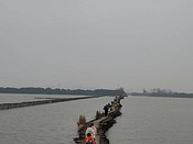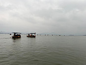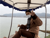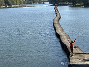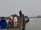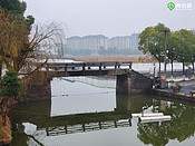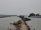 从宽阔的四个车道的沪昆高速下来,导航古纤道,被带到了萧绍运河旁,但由于春节假期不开门,所以就离开,到柯桥古镇旁吃了午饭。然后导航明心庵那里,把车往里开,停在村口,然后向昂桑湖走去。昂桑湖的名字应该是犭央犭茶湖,是绍兴最大的湖。 湖中有一处避风塘,塘堤就是现在的网红昂桑湖古纤道。其实这不是真正的纤道,而是避风塘堤,但并不妨碍它作为网红古纤道吸引游人如织。不同于运河上的古纤道,它是实心的,用2