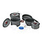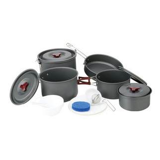 该套锅适合6-7人使用,采用进口铝材,高级硬质铝氧化,耐高温、磨擦。汤匙采用PP材料;饭勺、塑碗采用密胺材质,高硬度,耐高温。包括一煎锅、大锅、中锅、小锅、特小锅、汤勺、饭勺、百洁布及三只碟盘和六只碗。是一款整体压缩体积较小且重量轻的一款套锅。